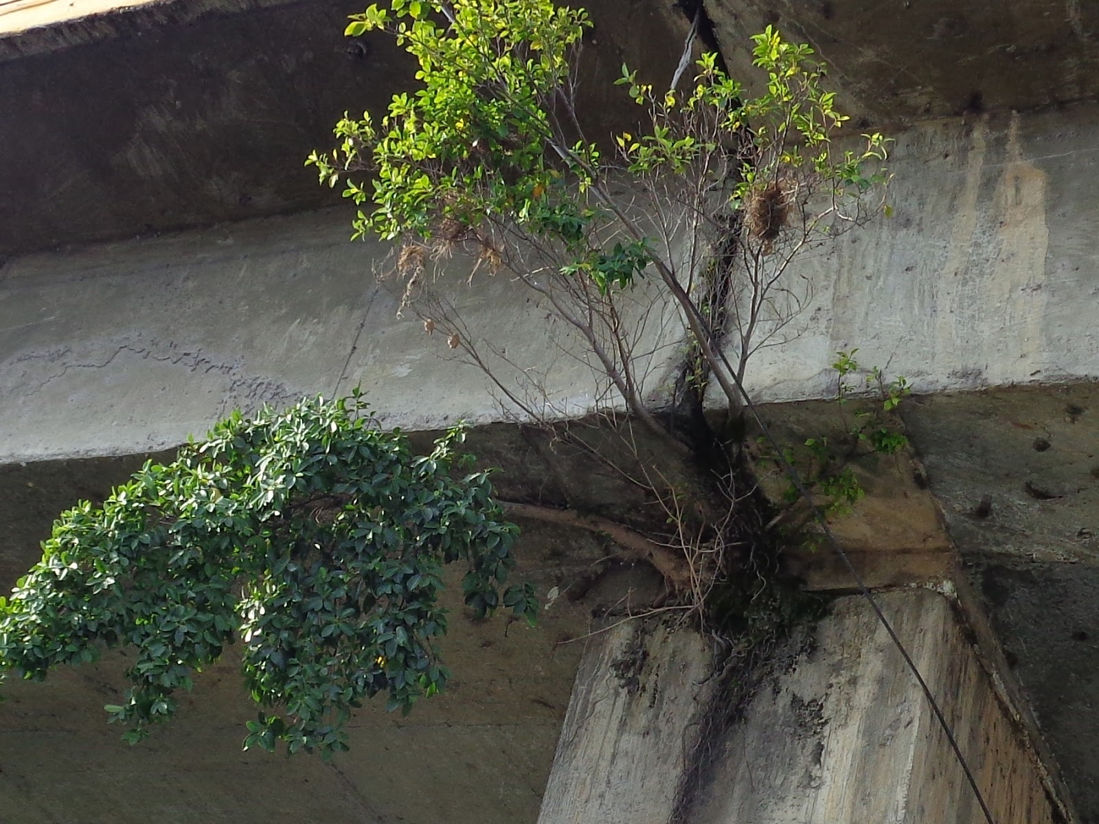 A natureza encontrou uma saída. Encravada no lado inferior da pista de rolagem do viaduto, um ficus nasceu e se desenvolveu, apesar da situação inóspita. Ali, alguns passarinhos, em condomínio fizeram seus ninhos. No dia 23 de janeiro de 2016, contei 3 ninhos habitados.